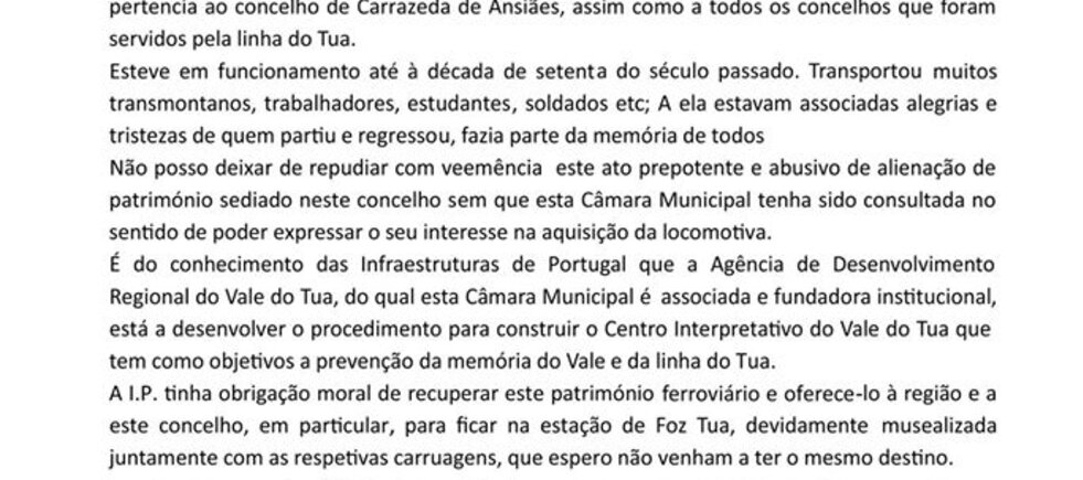 Carta enviada pelo Presidente da Câmara Municipal de Carrazeda de Ansiães à Administração das Infraestruturas de Portugal