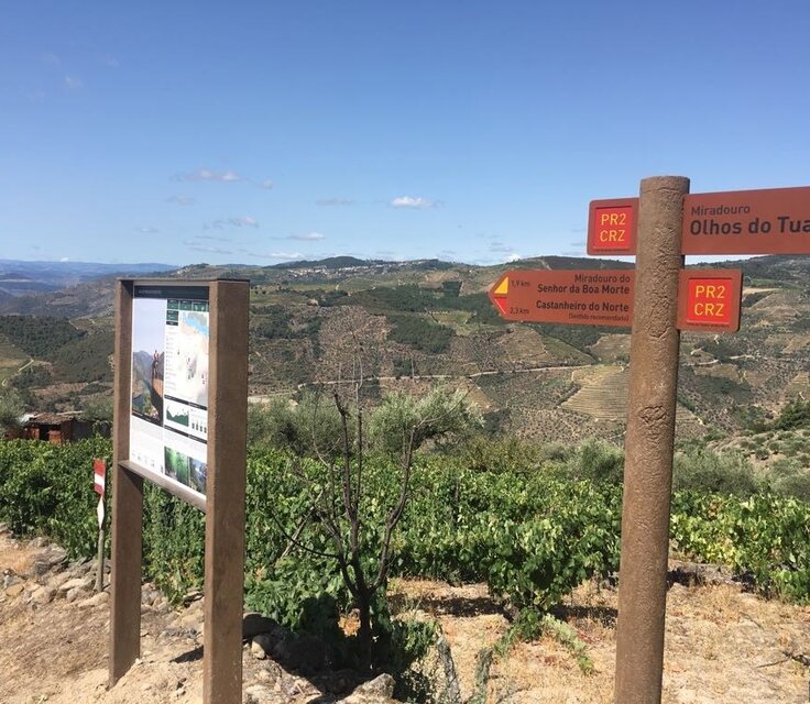 O trilho atravessa a aldeia e dirige-se para o Miradouro Olhos do Tua onde é possível ter uma vista privilegiada sobre o vale e o rio Tua.