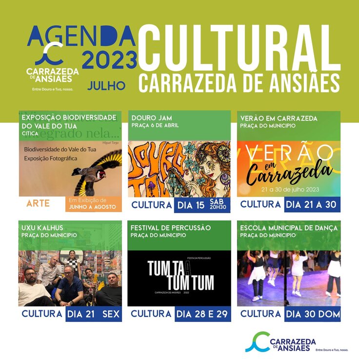 Dia 21 na abertura do Verão em Carrazeda atua o grupo Uxu Kalhos, grupo folk português que, segundo dizem, “as acuações são vibrantes e inesquecíveis”. Inserido no evento está uma vez mais o Festival de Percussão Tum Tá Tum Tum que vai por as principais artérias e praças da vila a ribombar com o ritmo dos seus tambores. E para encerrar o evento nada melhor que os artistas da casa, com a atuação das várias Turmas da Escola Municipal de Dança no dia 30 de julho.