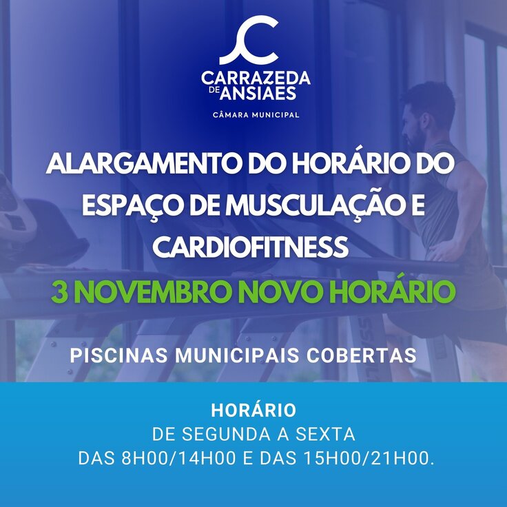 O Município de Carrazeda de Ansiães informa que a apartir do dia 3 de novembro, o Espaço Cardiofitness e Musculação, a funcionar nas Piscinas Municipais Cobertas, passa a dispor de horário alargado, proporcionando melhores condições de utilização a todos os frequentadores.