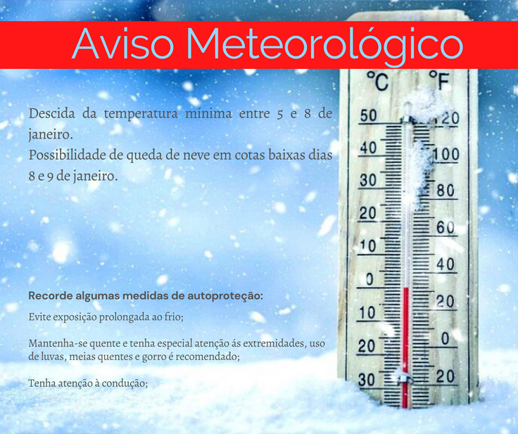O Instituto Português do Mar e da Atmosfera (IPMA) alerta para a descida da temperatura mínima e aumento da intensidade do vento, entre cinco e oito de janeiro e para a possibilidade de queda de neve em cotas baixas nos dias oito e nove deste mês.