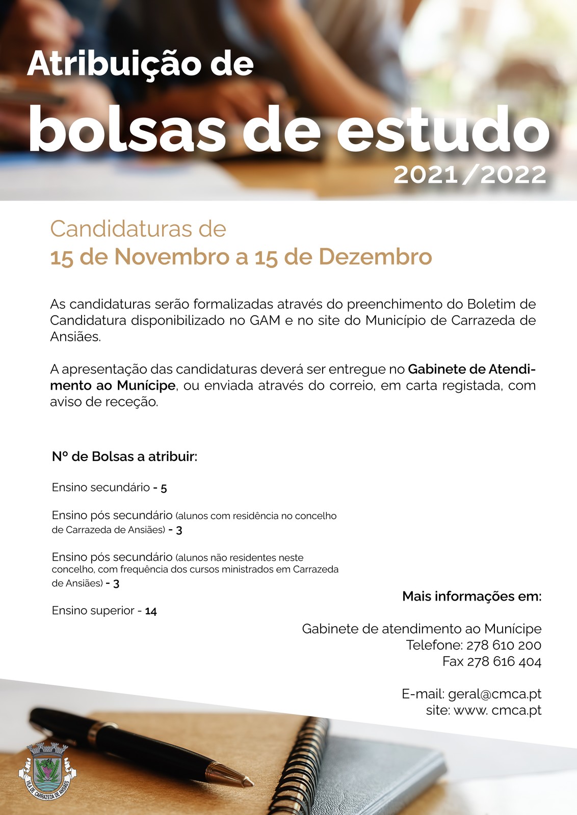 O Município de Carrazeda de Ansiães informa que estão a decorrer de 15 de novembro a 15 de dezembro as candidatura às bolsas de estudo para o ano letivo 2021/2022.