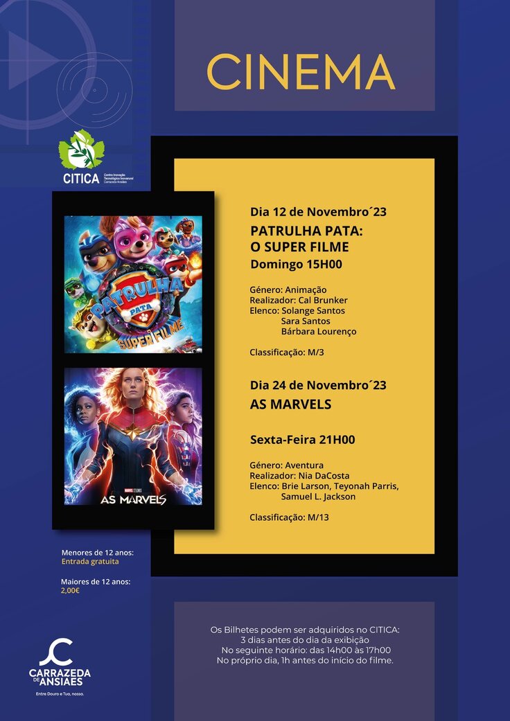 O Município de Carrazeda de Ansiães informa os seus munícipes das sessões de cinema para o mês de novembro. Dia 12 de novembro às 15h00 temos A Patrulha Pata: O Super Filme, um meteorito mágico aterra na Cidade da Aventura, a Patrulha Pata ganha superpoderes e transforma-se na Super Patrulha! Para Skye, a mais pequena da equipa, os novos poderes são um sonho tornado realidade. Mas tudo se complica, quando o arquirrival Humdinger foge da prisão e junta-se a Victoria Vance - uma cientista louca obcecada pelo meteorito – para roubar os superpoderes e tornarem-se super vilões. Produção do canal Nickelodeon e da Spin Master em colaboração com a Paramount Pictures, com a realização de Cal Brunker e vozes de Solange Santos, Sara Santos, Bárbara Lourenço.