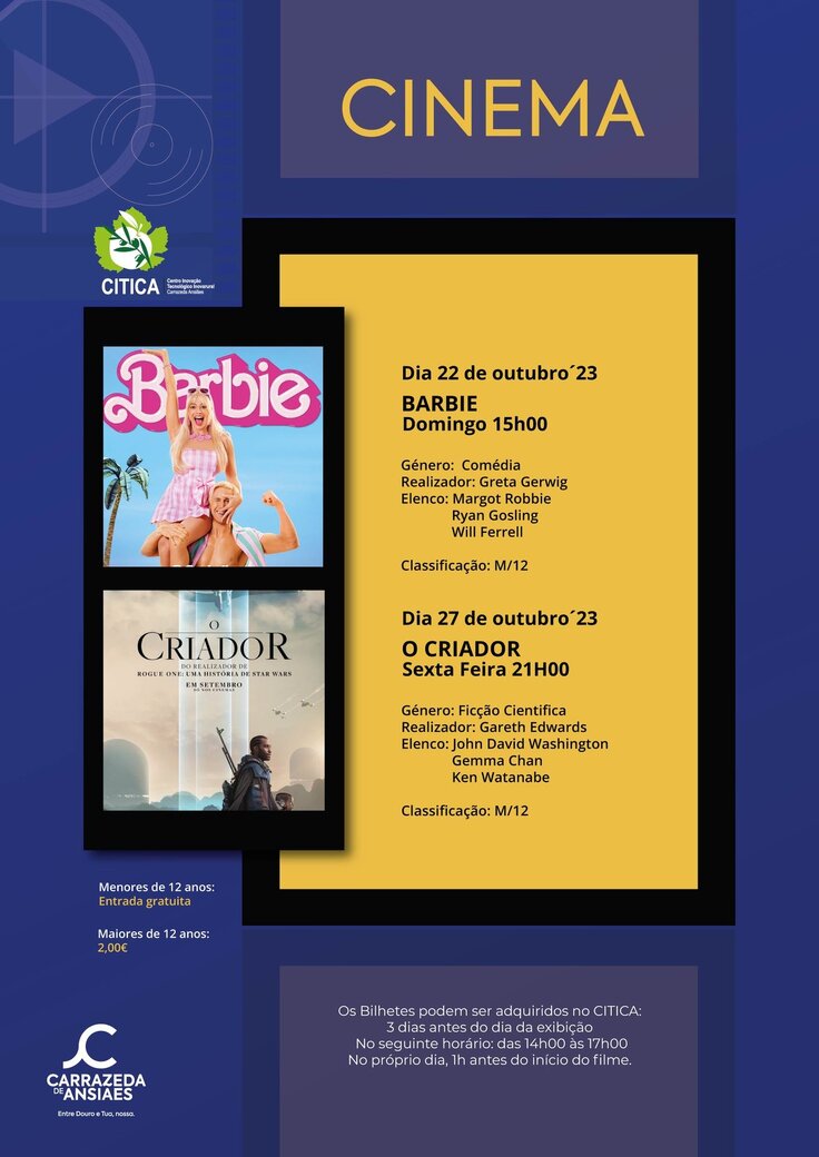 O Município de Carrazeda de Ansiães informa os seus munícipes das sessões de cinema para o mês de outubro. Dia 22 de outubro às 15h00 temos Barbie, o fabuloso live-action da boneca mais famosa do mundo, acompanhamos o dia a dia em Barbielândia. Onde tudo é festas e diversão ate que uma das bonecas começa a perceber que talvez sua vida não seja tão perfeita assim, questionando-se sobre o sentido de sua existência e alarmando suas companheiras. Forçada a viver no mundo real, Barbie precisa lutar com as dificuldades de não ser mais apenas uma boneca, enquanto isso, Barbie tem dificuldades para se ajustar, e precisa enfrentar vários momentos nada coloridos até descobrir que a verdadeira beleza está no interior de cada um. Dirigido por Greta Gerwig tem sido um sucesso de bilheteira por misturar problemas reais, com uma dose de comédia interpretada por Margot Robbie, Ryan Gosling, Will Ferrell, simu Liu, America Ferrera e Nicola Coughlan.