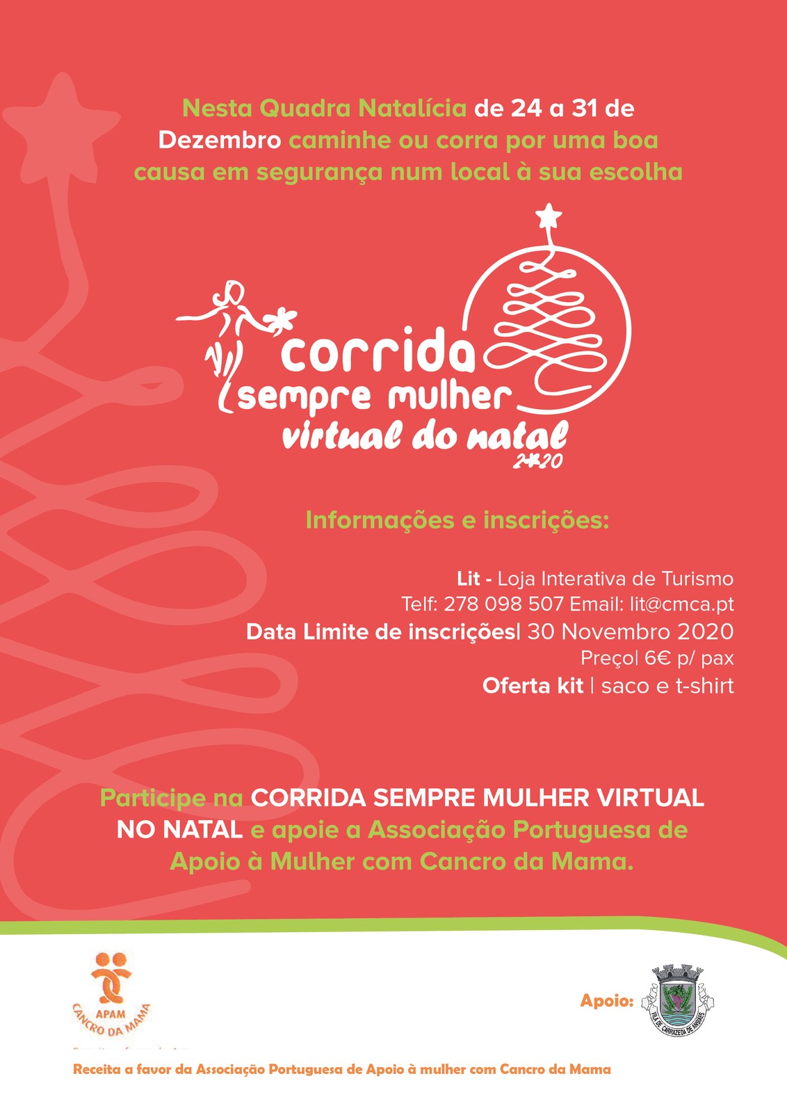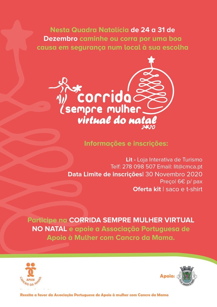 O Município de Carrazeda de Ansiães em colaboração com a Associação Portuguesa de Apoio à Mulher com Cancro da Mama promovem a Corrida Sempre Mulher Virtual de Natal. Se queres aderir a esta inciativa inscreve-te na Loja Interativa de Turismo, até ao dia 30 de Novembro, para a aquisição dos kits de participação, com o custo unitário de 6 euros.
