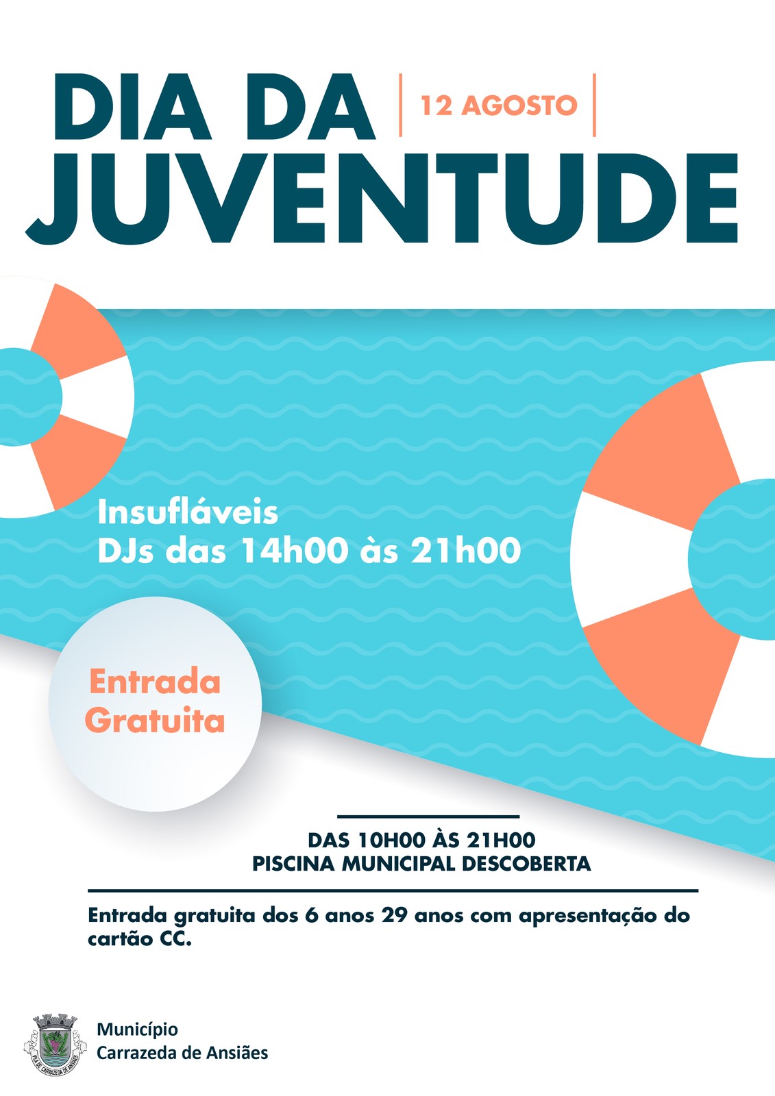 Dia 12 de agosto das 10h00 às 21h00 a entrada na piscina é gratuita dos 6 aos 29 anos, obrigatória a apresentação de cartão de cidadão (CC). Haverá insufláveis para os mais pequenos e não faltará música com DJs para animar o dia e início de noite.