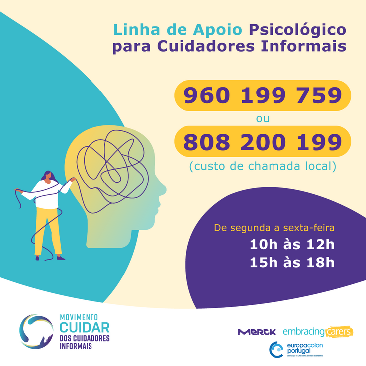 Desde 1 de setembro está disponível a Linha de Apoio Psicológico destinada aos cuidadores informais, esta é uma iniciativa com o apoio da Merck, no âmbito do Movimento Cuidar dos Cuidadores informais, monitorizada pela Europacolon Portugal.