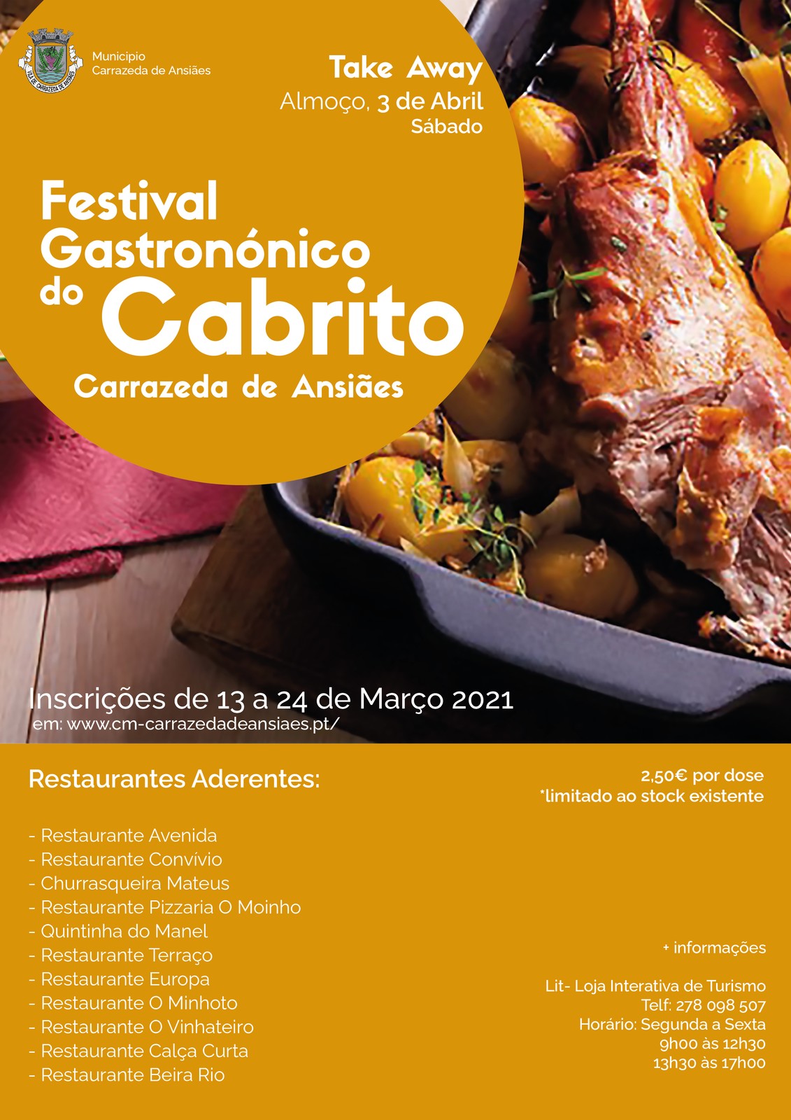 O Município de Carrazeda de Ansiães vai promover o Festival Gastronómico do Cabrito no próximo dia 03 de abril. A iniciativa vai ser em regime de take-away e conta com a participação de 11 restaurantes do concelho que irão confecionar 500 doses individuais de cabrito assado no forno.
