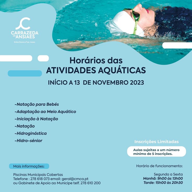 Podem consultar o horário das aulas e preçário no nosso site em: https://www.cm-carrazedadeansiaes.pt/servicos/desporto/atividades-desportivas/escola-de-natacao .