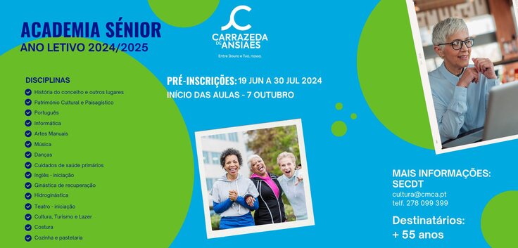 O Município de Carrazeda de Ansiães informa que estão abertas até ao dia 30 de Julho as pré-inscrições para a Academia Sénior, ano letivo 2024/2025.