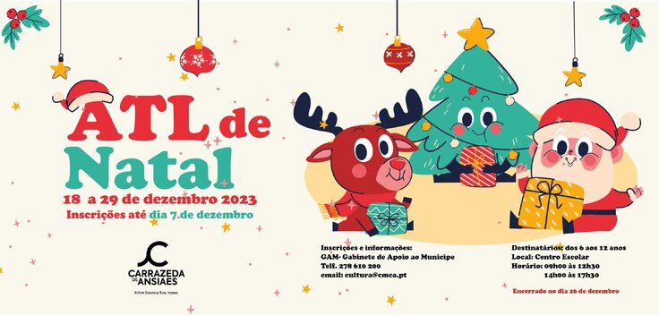 O ATL de Natal tem como destinatários as crianças com idades compreendidas entre os 6 e os 12 anos e vai decorrer nas instalações do Centro Escolar de Carrazeda de Ansiães entre os dias 18 e 29 de dezembro.