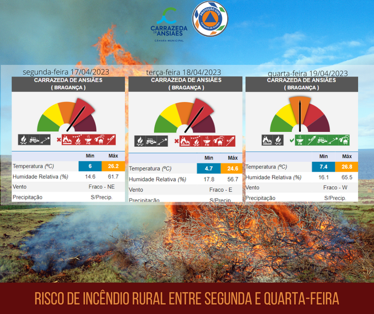 Considerando a necessidade de adotar medidas preventivas e especiais de reação face ao risco de incêndio rural, o Instituto Português do Mar e da Atmosfera prevê que esta segunda e terça-feira o Nível de Perigo de Incêndio seja “Muito elevado” para todo o concelho de Carrazeda de Ansiães. Nestes dias:
