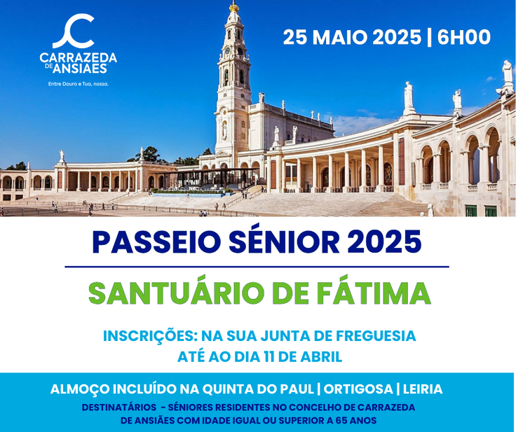 O Município de Carrazeda de Ansiães está a organizar mais um Passeio Sénior, destinado a todos os residentes do concelho com idade igual ou superior a 65 anos, desta vez o destino é o Santuário de Nossa Senhora de Fátima, a 25 de maio.
