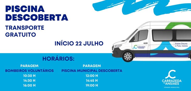 O Município de Carrazeda de Ansiães informa que a partir do dia 22 de julho, será fornecido transporte gratuito para as Piscinas Municipais Descobertas no seguinte horário: