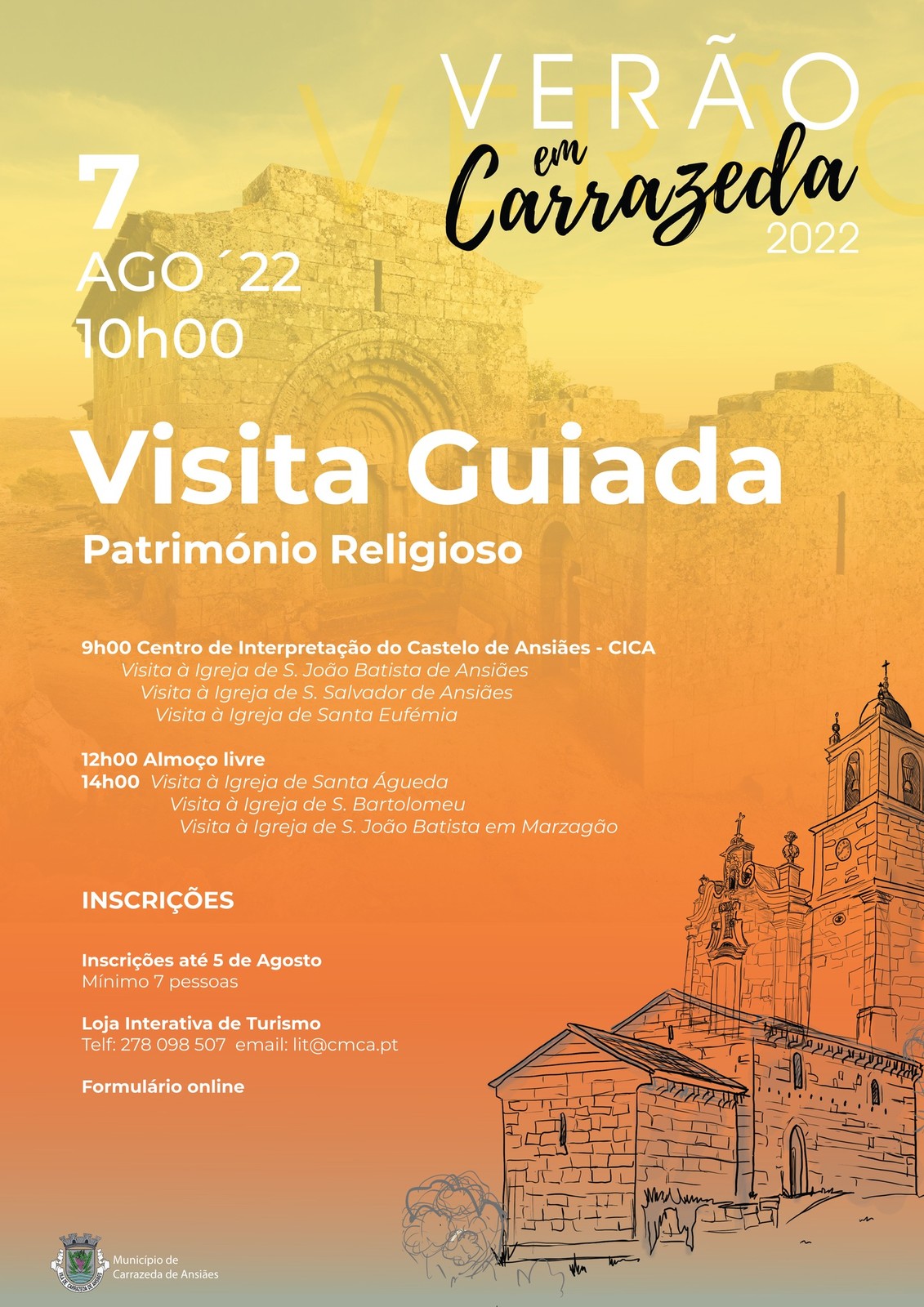 O Município de Carrazeda de Ansiães informa que se encontram abertas as inscrições para a Visita Guiada Património Religioso que se realiza no dia 07 de agosto. Os interessados podem-se inscrever até dia 05 de agosto através do formulário disponível no nosso site ou presencialmente na Loja Interativa de Turismo (LIT).