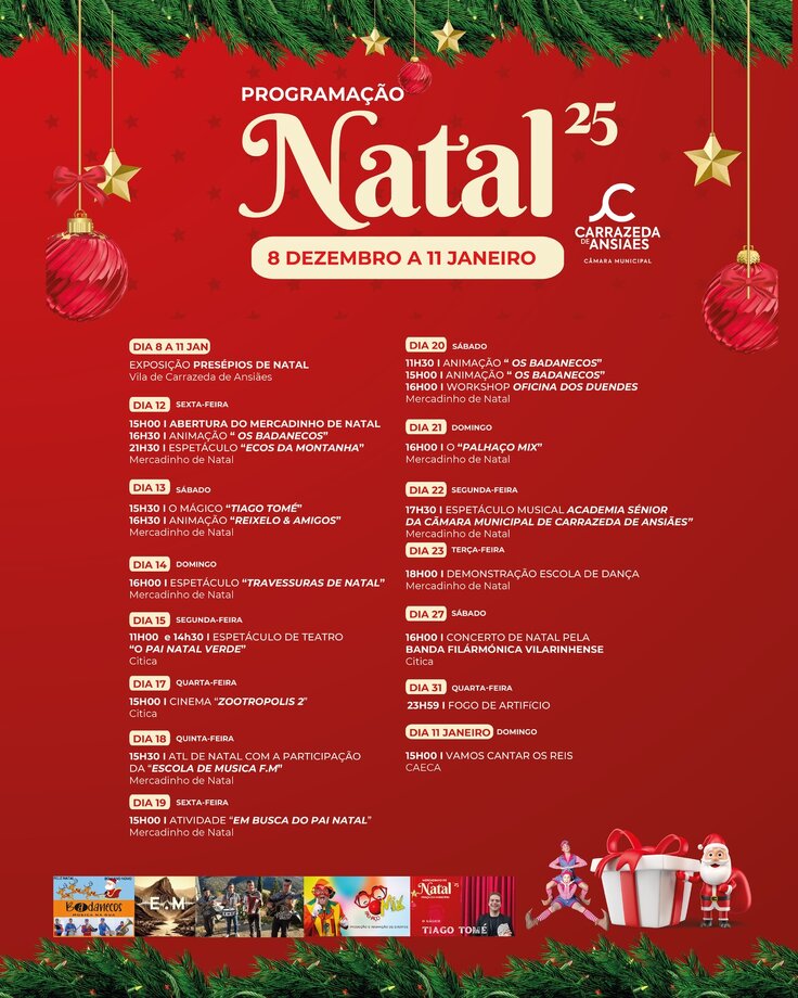 O Município de Carrazeda de Ansiães divulga o seu extenso Programa de Natal '25, que promete envolver toda a comunidade em festividades, cultura e convívio, de 8 de Dezembro a 11 de Janeiro de 2026.
