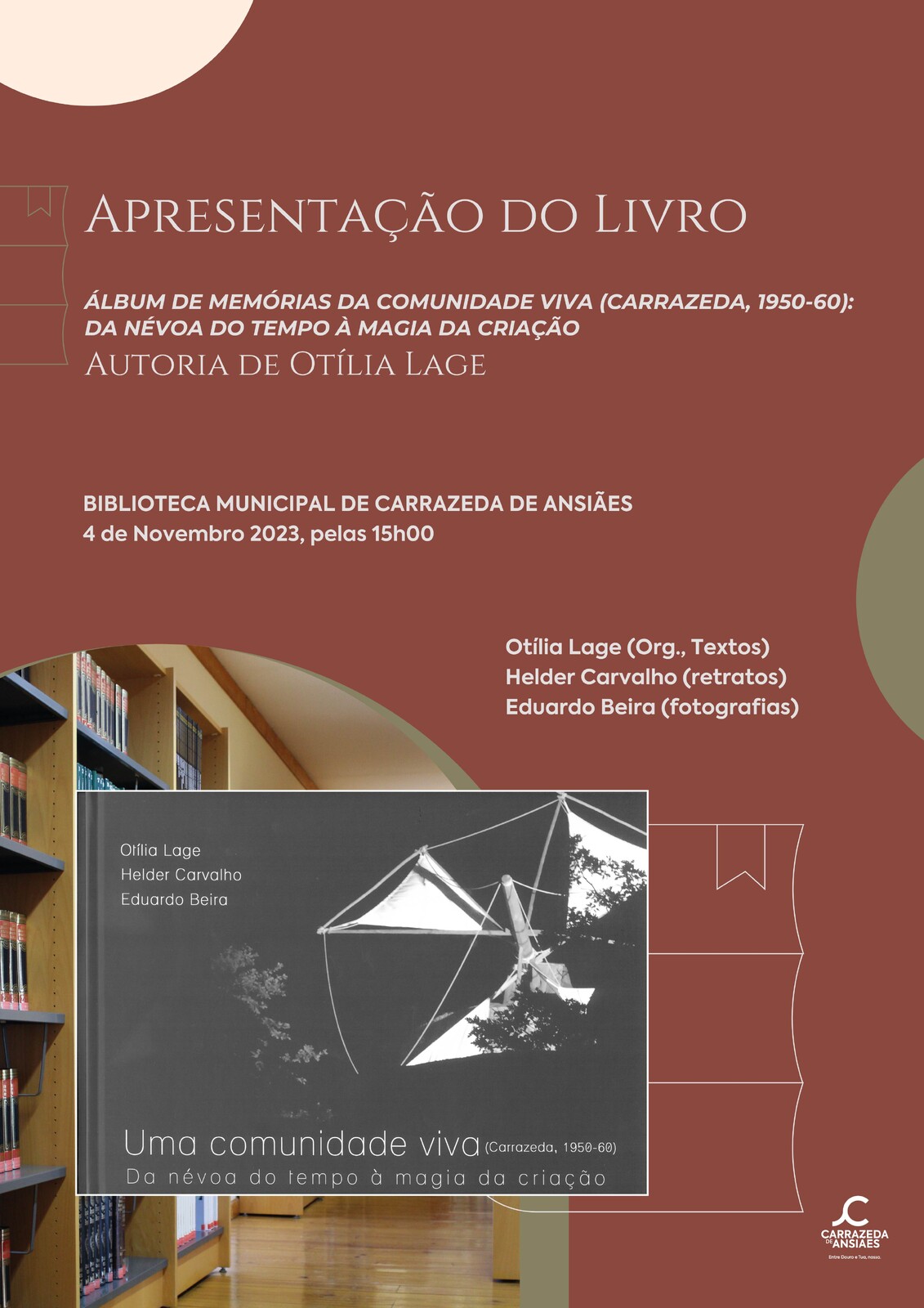Pelas 15h00 viaja-se pelas memórias da comunidade carrazedense dos anos 50 e 60 do séc. XX através dos textos da autora, Otília Lage, dos retratos de Hélder Carvalho e das fotografias de Eduardo Beira em “Álbum de Memórias da Comunidade Viva – Da Névoa do Tempo à Magia da Criação”.