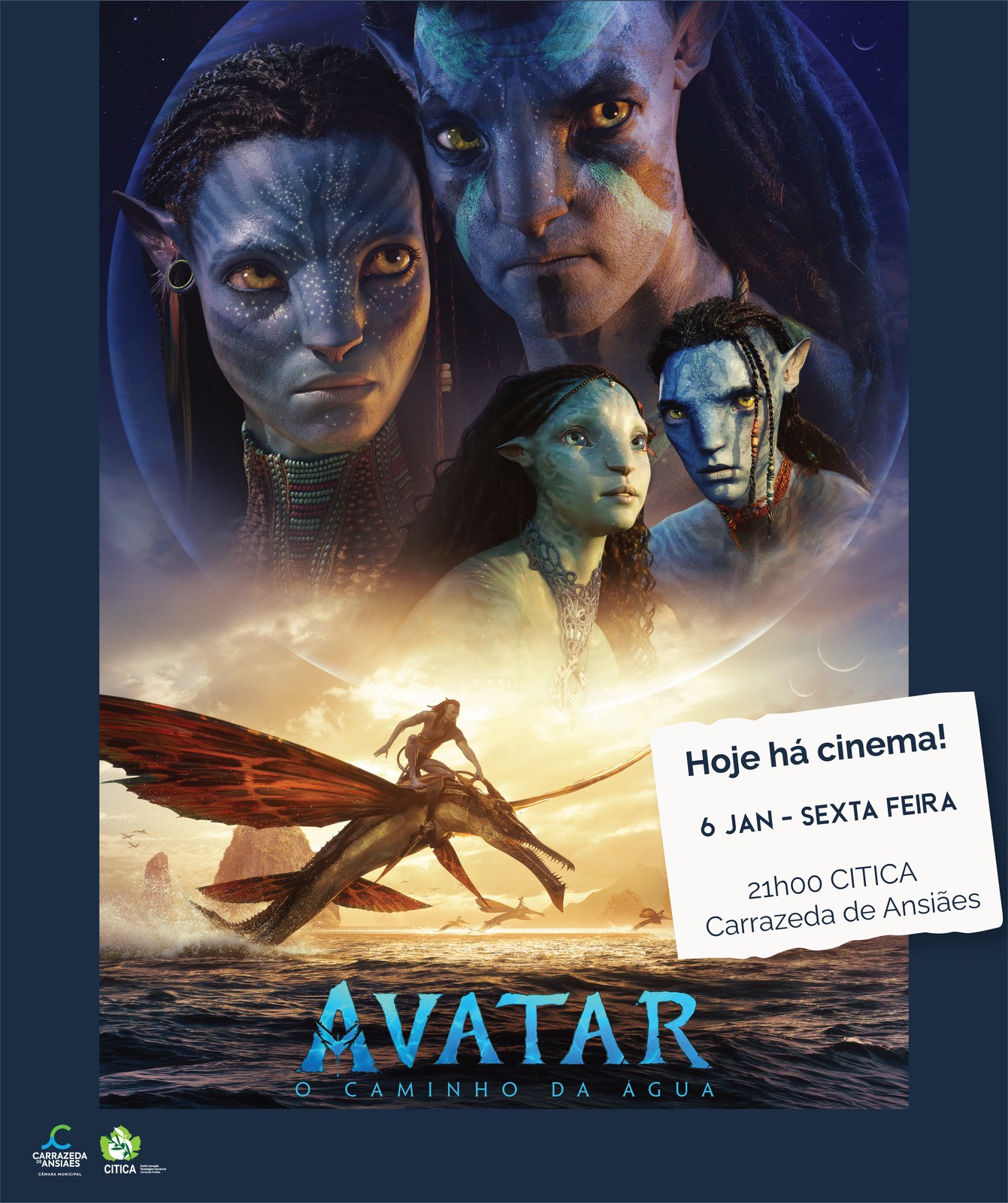 O Município de Carrazeda de Ansiães informa os seus munícipes das sessões de desta sexta-feira 6 de janeiro. O filme decorre uma década após os acontecimentos do primeiro filme e conta a história da família Sully (Jake, Neytiri e os seus filhos), os seus problemas, as longas distâncias que vão percorrer para se manterem a salvo, as batalhas que lutam para se manterem vivos, e as tragédias que suportam. Realizado por Realizador: James Cameron e tendo como atores principais Sam Worthington, Zoe Saldaña, Sigourney Weaver promete muita aventura e efeitos especiais.