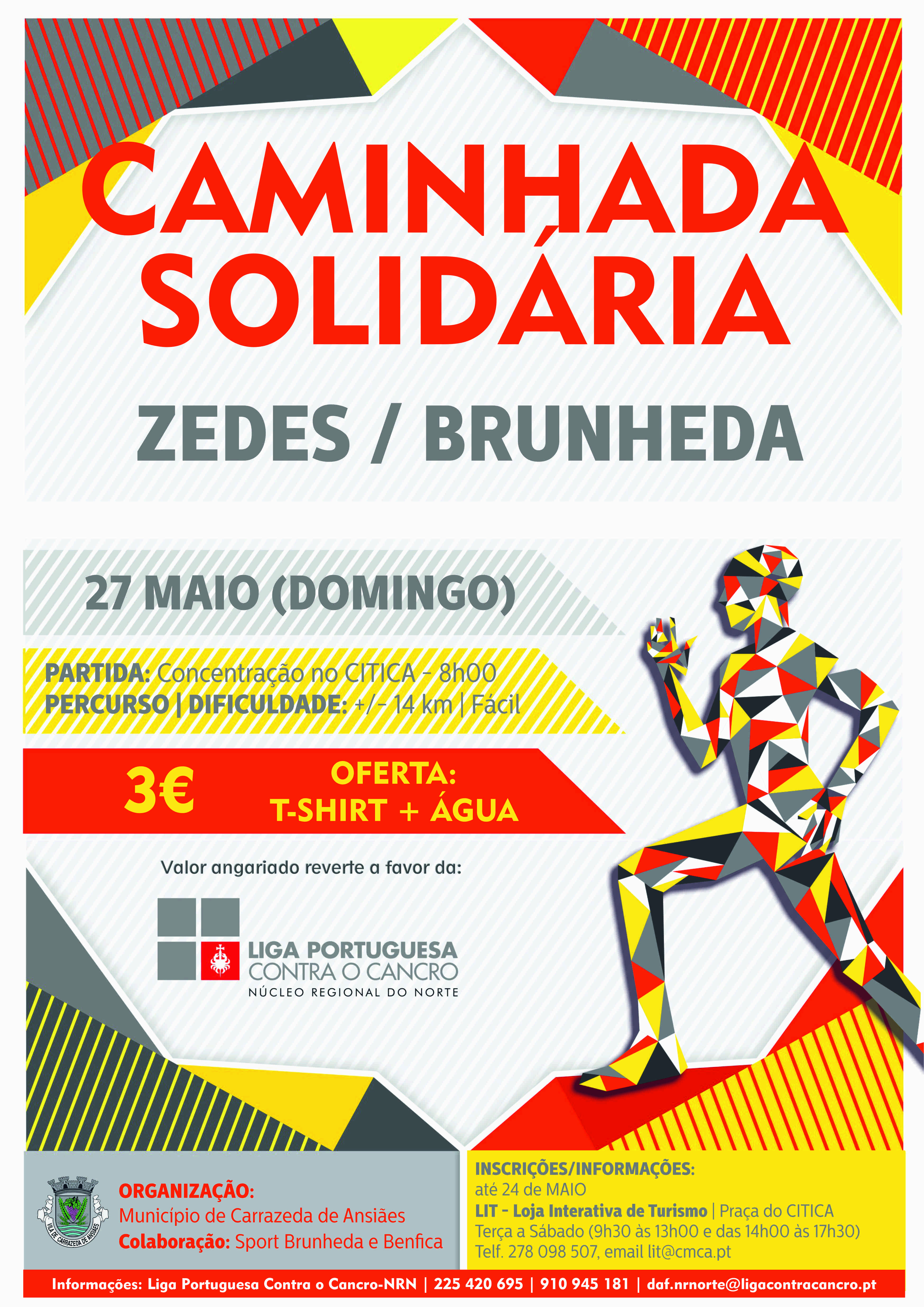 O Município de Carrazeda de Ansiães informa que estão abertas, na Loja Interativa de Turismo, até ao dia 24 de Maio, as inscrições para a Caminhada Solidária entre Zedes - Brunheda que se irá realizar no dia 27 de Maio. O valor da inscrição, 3€, reverte na integra em favor da Liga Portuguesa Contra o Cancro.