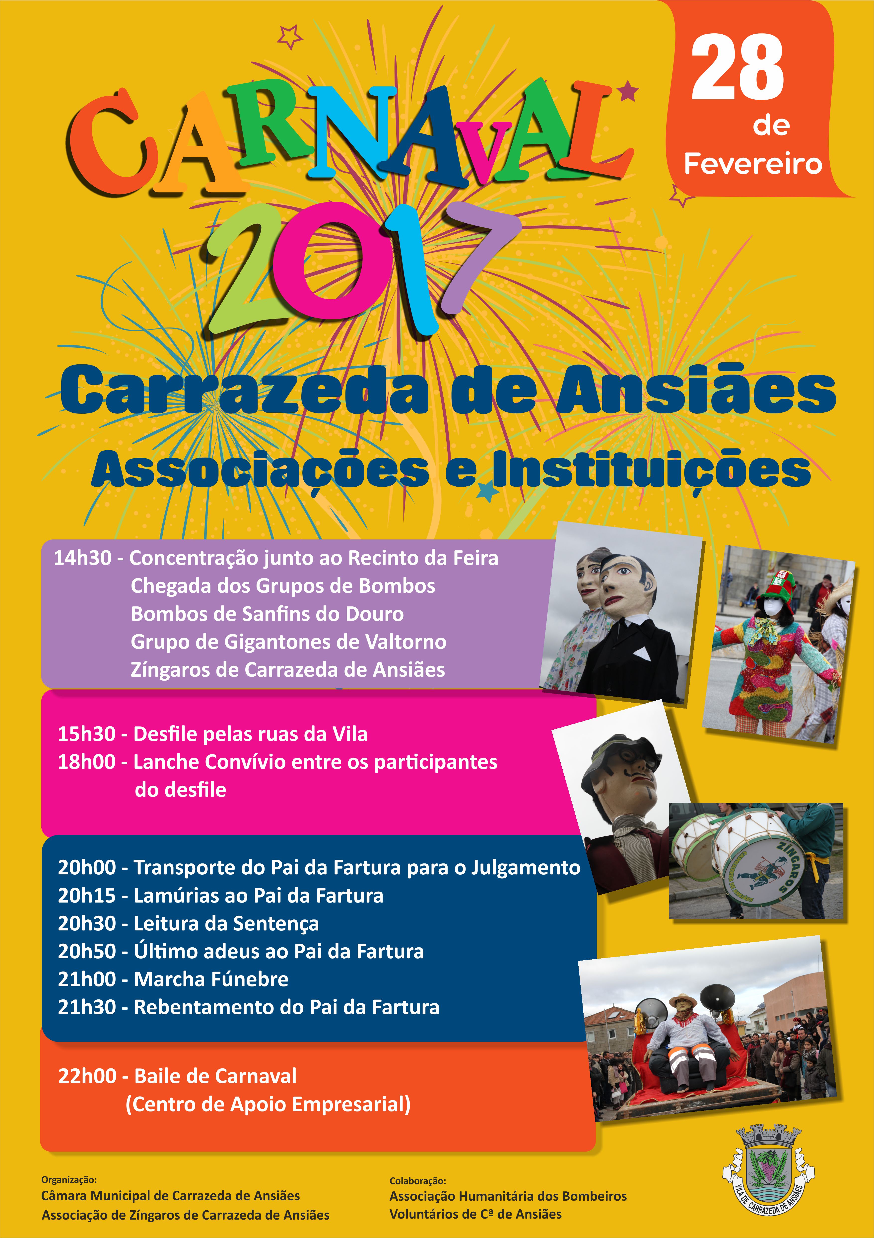 No dia 28 de Fevereiro, pelas 15h30m, a autarquia, em colaboração com a Associação os Zingaros, irá organizar mais um desfile de Carnaval das Associações e Instituições do Concelho. A concentração dos participantes está marcada para as 14h30, junto ao recinto da feira e, como em anos transactos, prevê-se uma forte adesão por parte das organizações associativas do concelho. No final da tarde, pelas 20.00 horas, no largo do pelourinho de Carrazeda de Ansiães, ocorrerá o transporte do pai da fartura para o julgamento final e a leitura da sua sentença. Seguidamente o pai da fartura segue em cortejo fúnebre para o recinto do mercado municipal onde será rebentado. O dia vai terminar em grande com um Baile de Carnaval no Centro de Apoio Empresarial de Carrazeda de Ansiães.