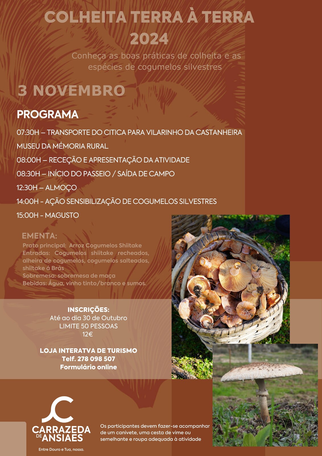A Colheita Terra à Terra vai ter lugar no dia 3 de novembro em Vilarinho da Castanheira, os interessados podem inscrever-se Loja Interativa de Turismo, ou através do formulário disponível nas nossas redes sociais, até ao dia 30 de outubro. A atividade tem um custo de 12€ por pessoa e está limitada a um número de 50 participantes.