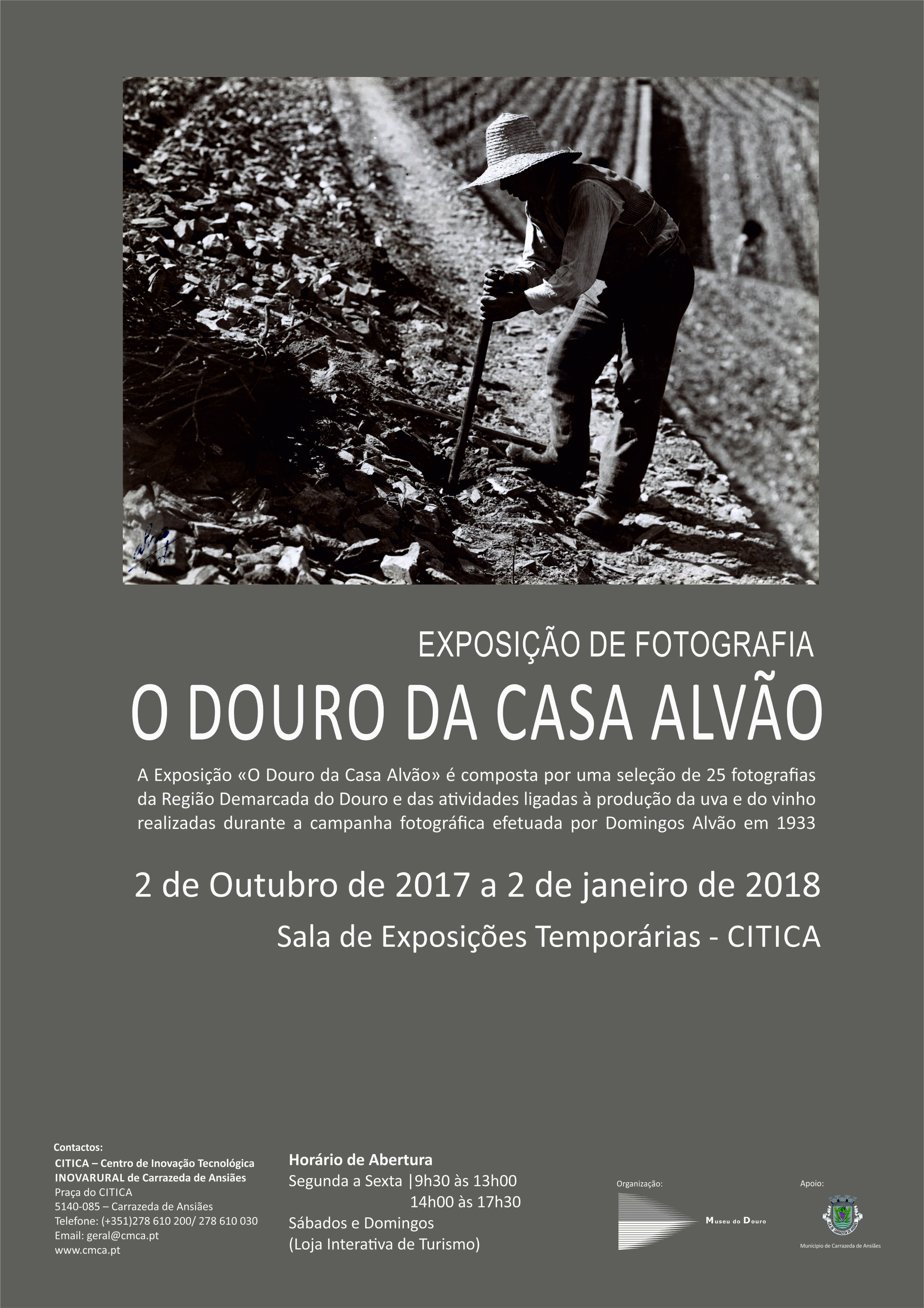 Vai estar patente na sala de Exposições Temporárias do CITICA de Carrazeda de Ansiães, entre os dias 2 de Outubro de 2017 e o dia 2 de Janeiro de 2018, a Exposição de Temporária "O Douro da Casa Alvão", organizada pelo Museu do Douro. A Exposição «O Douro da Casa Alvão» é composta por uma seleção de 25 fotografias da Região Demarcada do Douro e das atividades ligadas à produção da uva e do vinho realizadas durante a campanha fotográfica efetuada por Domingos Alvão em 1933.