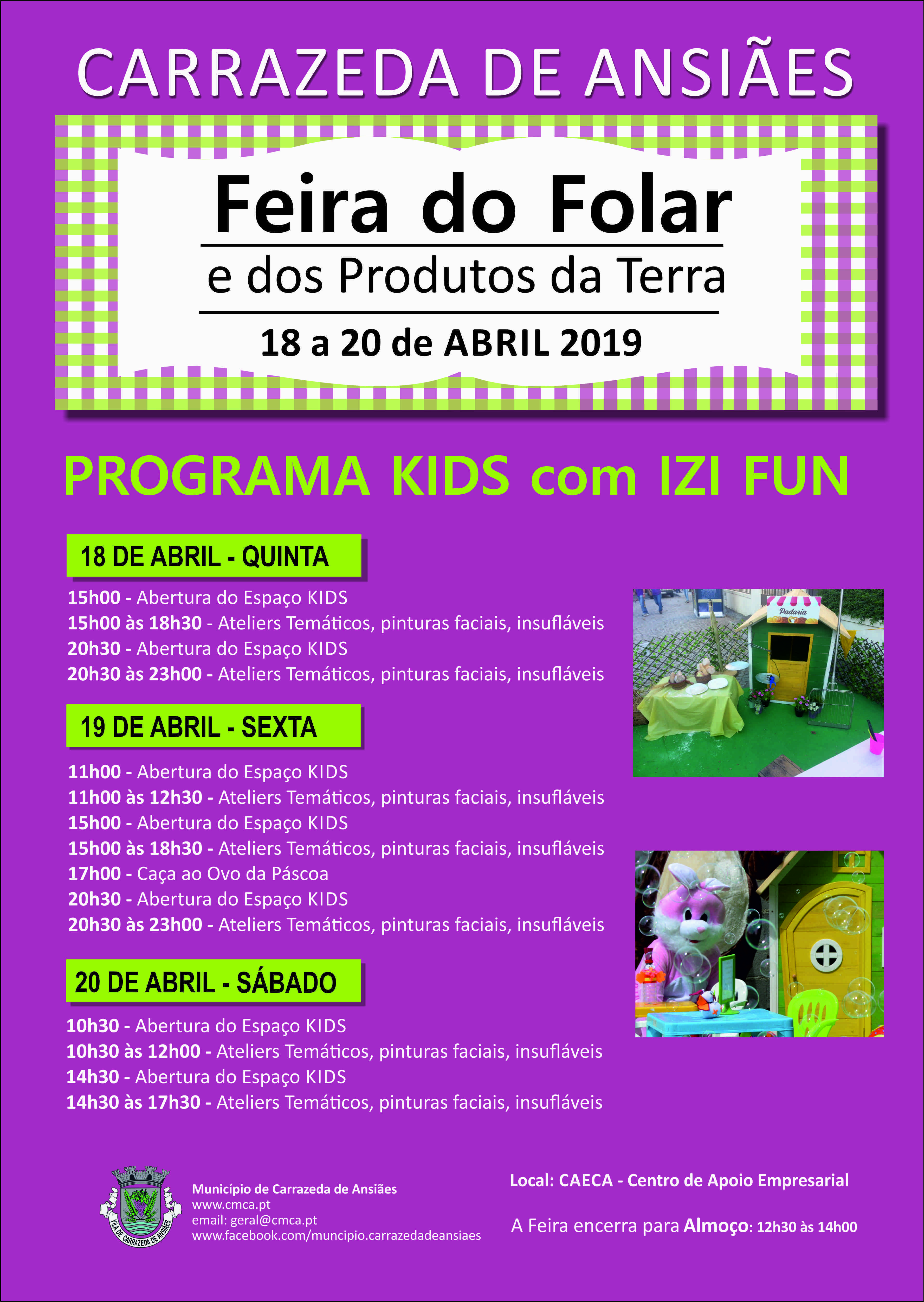 A pensar no divertimento dos mais novos, o Município de Carrazeda de Ansiães organizou um programa Kids, para os 3 dias da Feira do Folar e dos Produtos da Terra. São diversas as atividades que vão decorrer na nave do CAECA desde ateliers que têm por base temas como a pascoa e o folar, uma caça aos ovos, insufláveis e pinturas faciais. Não deixe de nos visitar e trazer os mais pequenos que com toda a certeza vão adorar o que preparámos para eles.