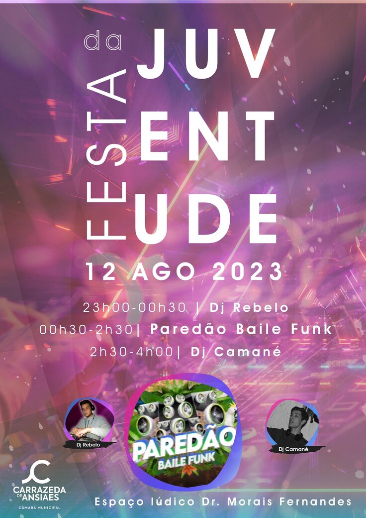 Na programação da Festa da Juventude estão as atuações de dois DJs do concelho, DJ Rebelo e DJ Camané que têm a cargo a abertura e o fecho da noite respetivamente. E o grande nome da noite é Paredão Baile Funk que promete ritmos quentes e envolventes para uma noite imperdível.