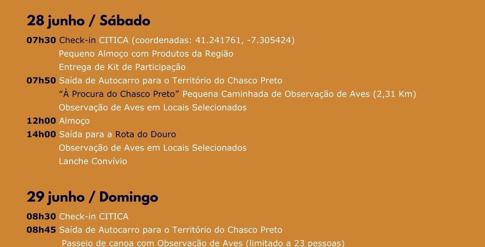 As inscrições para a atividade de sábado são limitadas e têm um custo de 25€, que inclui um kit de participação assim como o almoço. A atividade de domingo consiste num passeio de canoa no rio Tua, uma forma diferente de ver aves.