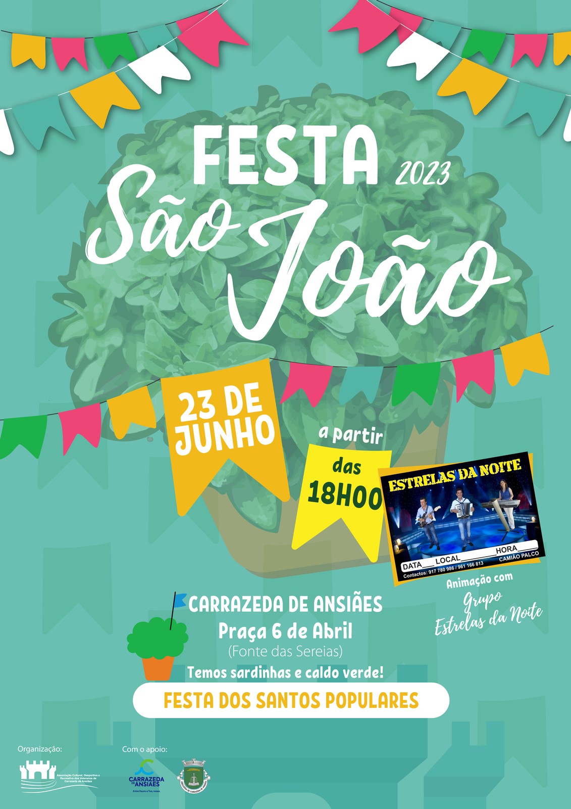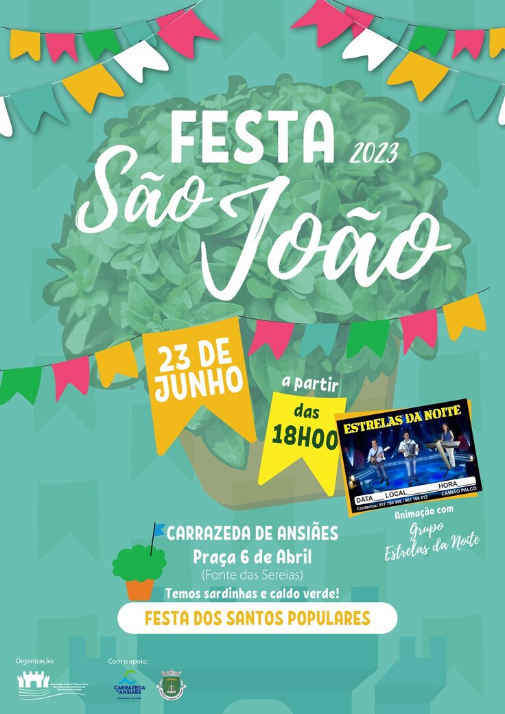 Dia 23 de junho a partir das 18h00 na Praça 6 de abril há sardinhas, caldo verde e muita animação com o grupo musical Estrelas da Noite.
