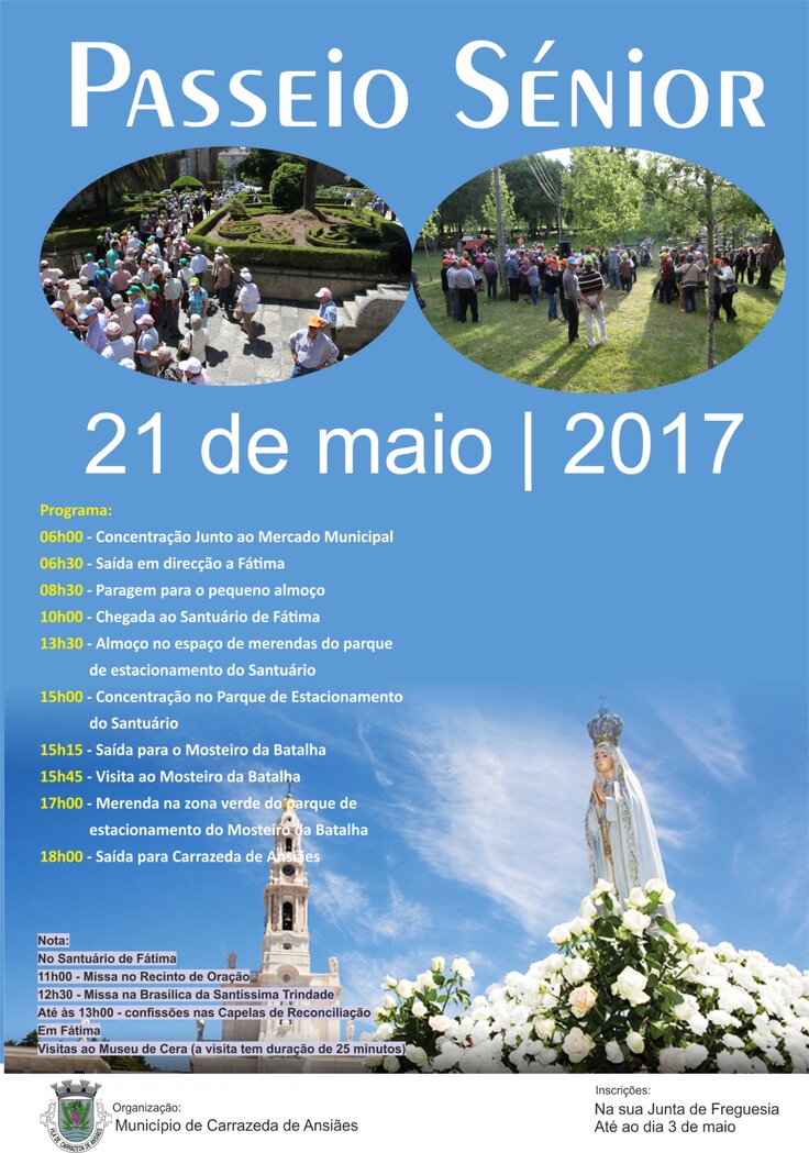 Passeio Sénior 2017, destino Santuário de Fátima e Mosteiro da Batalha. Inscrições na sua Junta de Freguesia até ao dia 3 de Maio.