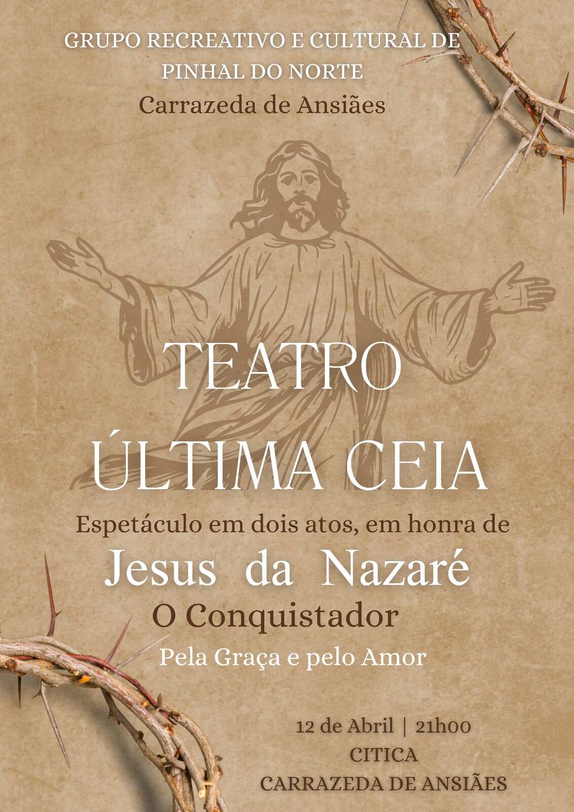 No dia 12 de abril, pelas 21h00, o auditório do CITICA vai receber a peça de teatro, "A Última Ceia", produzida e interpretada pelo Grupo Recreativo e Cultural de Pinhal do Norte.