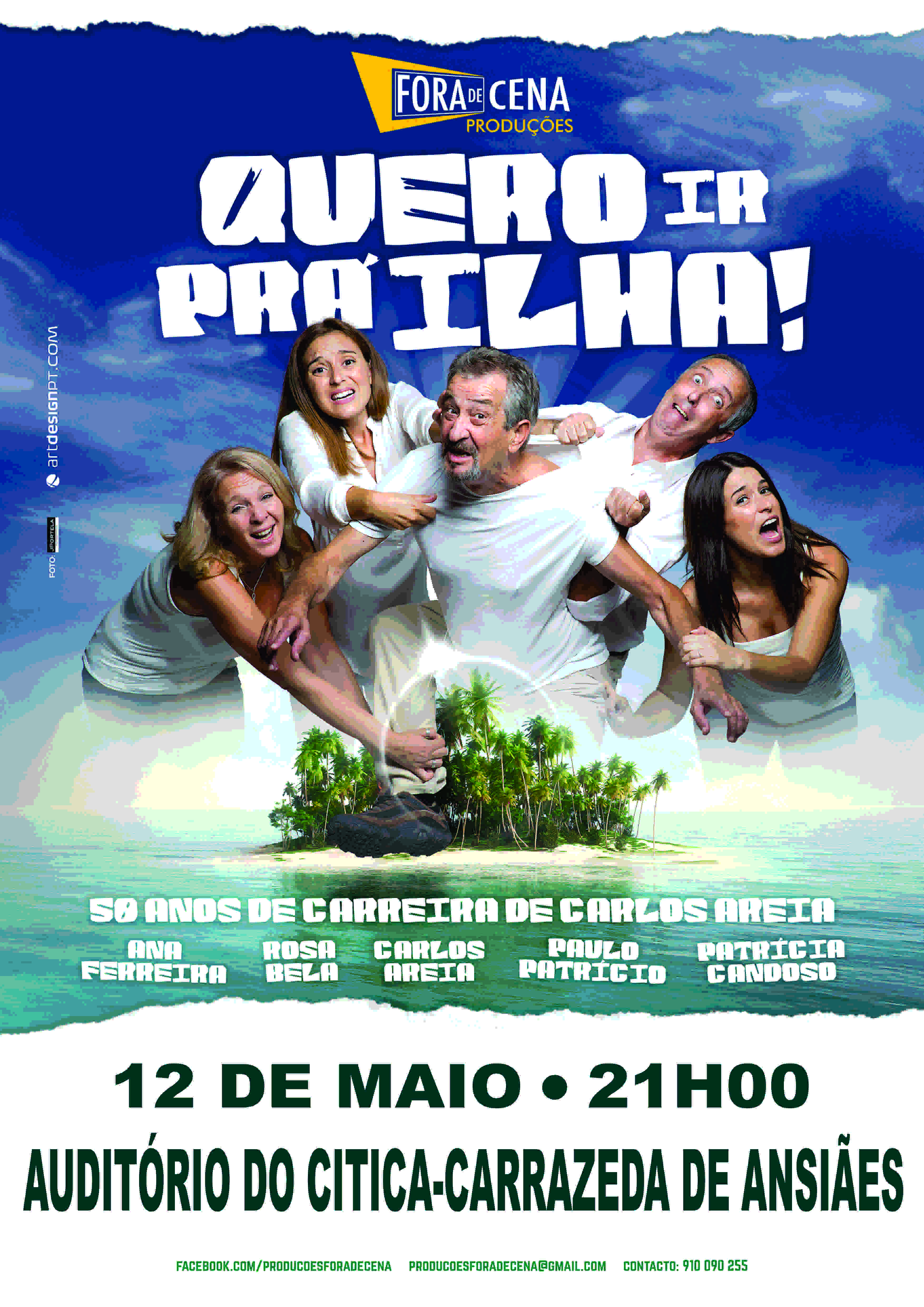 Novo espetáculo de Produções Fora de Cena, uma comédia musical inspirada na revista à portuguesa.Quero Ir Prá Ilha comemora os 50 anos do ator Carlos Areia dedicados ao Palco! Promete diversão, gargalhadas e muita música, com uma homenagem ao Festival da Canção.