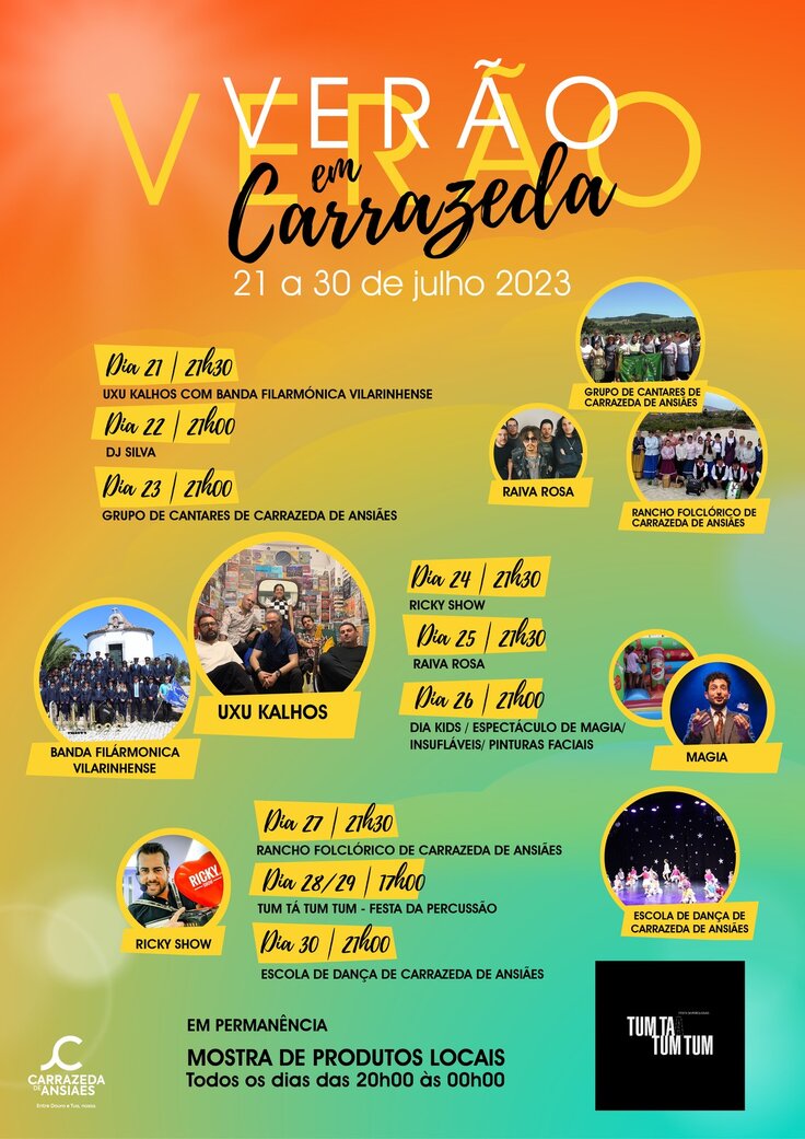 Dia 21 na abertura do Verão em Carrazeda atua o grupo Uxu Kalhos , grupo folk português que, segundo dizem, “as acuações são vibrantes e inesquecíveis”. Neste espectáculo os Uxu Kalhus são acompanhados pela Banda Filarmónica Vilarinhense. Inserido no evento está uma vez mais o Festival de Percussão Tum Tá Tum Tum que vai por as principais artérias e praças da vila a ribombar com o ritmo dos seus tambores. E para encerrar o evento nada melhor que os artistas da casa, com a atuação das várias Turmas da Escola Municipal de Dança no dia 30 de julho.