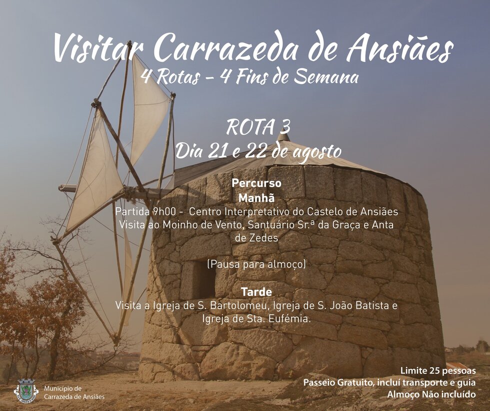 A rota levará os visitantes ao Moinho do Vento em Carrazeda de Ansiães, à Anta de Zedes, ao Santuário da Senhora da Graça da parte de manhã. À tarde poderão visitar a Igreja de S. Bartolomeu, a Igreja de S. João Batista e por fim a Igreja de Santa Eufémia.