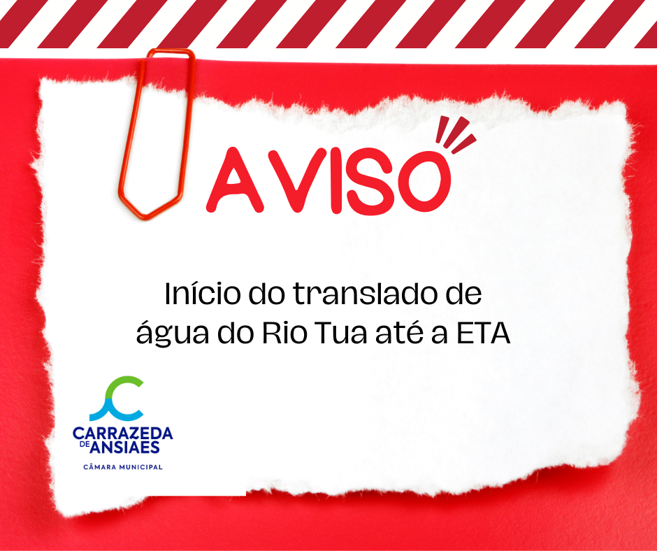 O Município de Carrazeda de Ansiães informa que vai iniciar-se na próxima terça-feira, 06 de setembro o translado de água do Rio Tua, mais concretamente da localidade da Brunheda, na margem do Rio Tua, até à Estação de Tratamento de Água (ETA) com recurso a camiões cisterna.