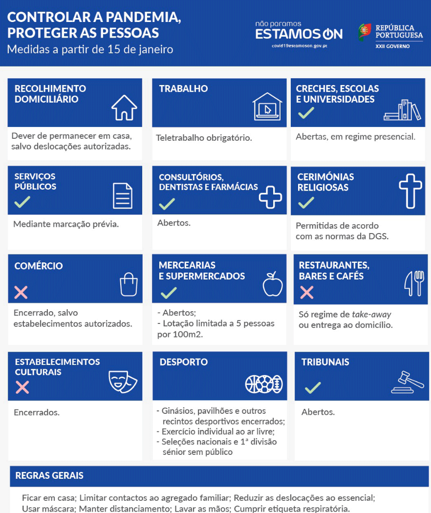O novo Estado de Emergência entrou hoje, 15 de janeiro às 00h00 em vigor e prolonga-se até dia 30 deste mês, conheça aqui as novas regras para controlar a pandemia.