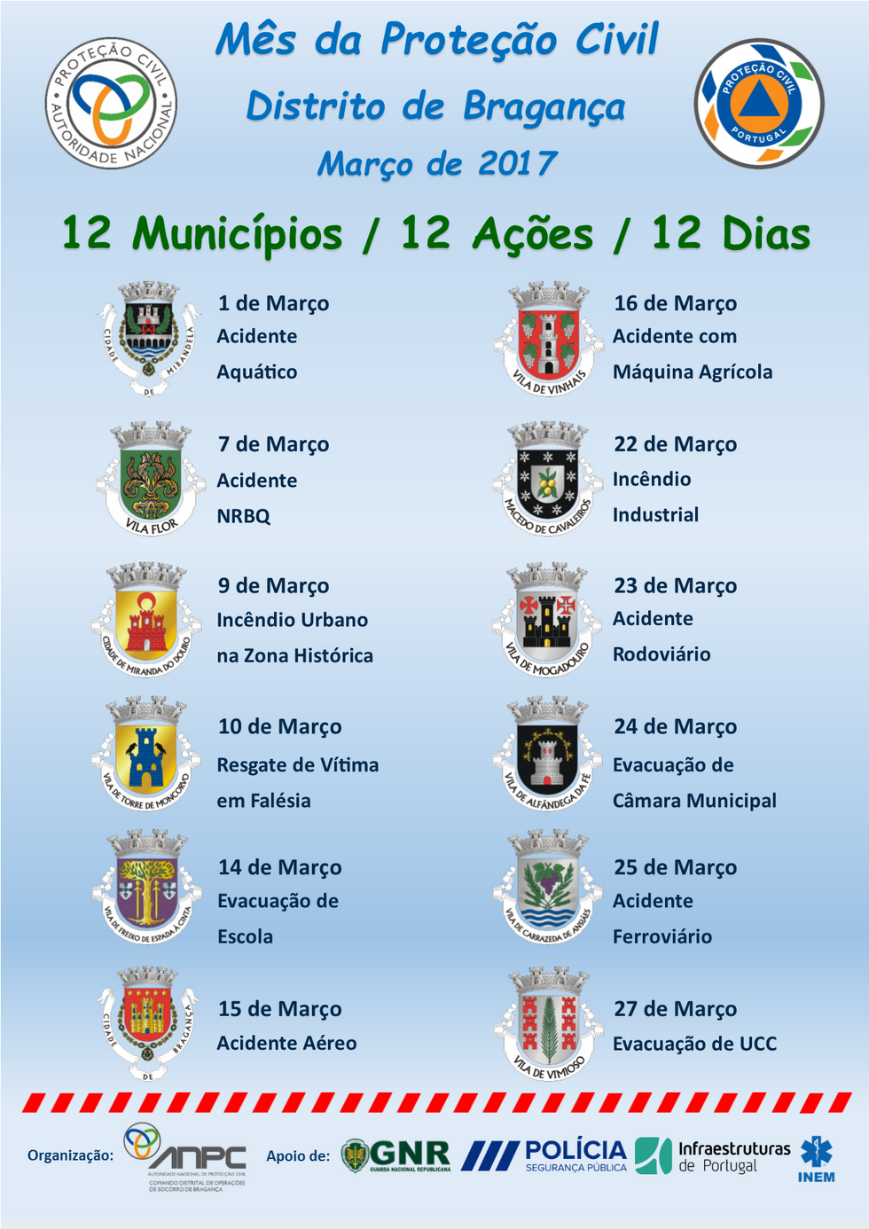 O Comando Distrital de Operações de Socorro de Bragança vai assinalar o Dia Mundial da Protecção Civil com uma ação por cada concelho do Distrito. Cada concelho irá acolher um exercício simulado, pensado de acordo com as características envolventes. Em Carrazeda de Ansiães irá decorrer no dia 25 de Março um exercício de simulação de um acidente ferroviário.