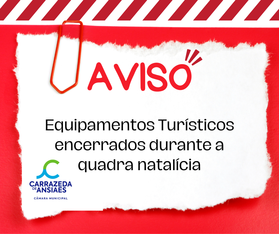 O Município de Carrazeda de Ansiães informa que os equipamentos turísticos municipais onde se incluem a Loja Interativa de Turismo, o CIVT - Centro Interpretativo do Vale do Tua, Portas de Entrada do Vale do Tua, Casa dos Cantoneiros, Museu da Memória Rural em Vilarinho da Castanheira, estarão encerrados ao público nos dias 23, 24, 25 e 31 de dezembro de 2022 e no dia 1 de janeiro de 2023.