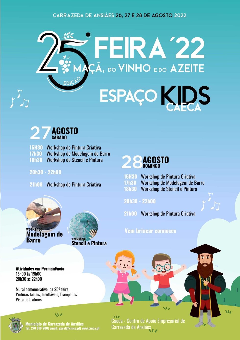 A maior festa do concelho está quase aí e vem cheia de animação e claro que as crianças não foram esquecidas. Nos dias 27 e 28 de agosto entre as 15h30 e 22h00 há workshops, pinturas, insufláveis, trampolins, pista de tratores e muito mais, o CAECA é o sítio onde tudo acontece.