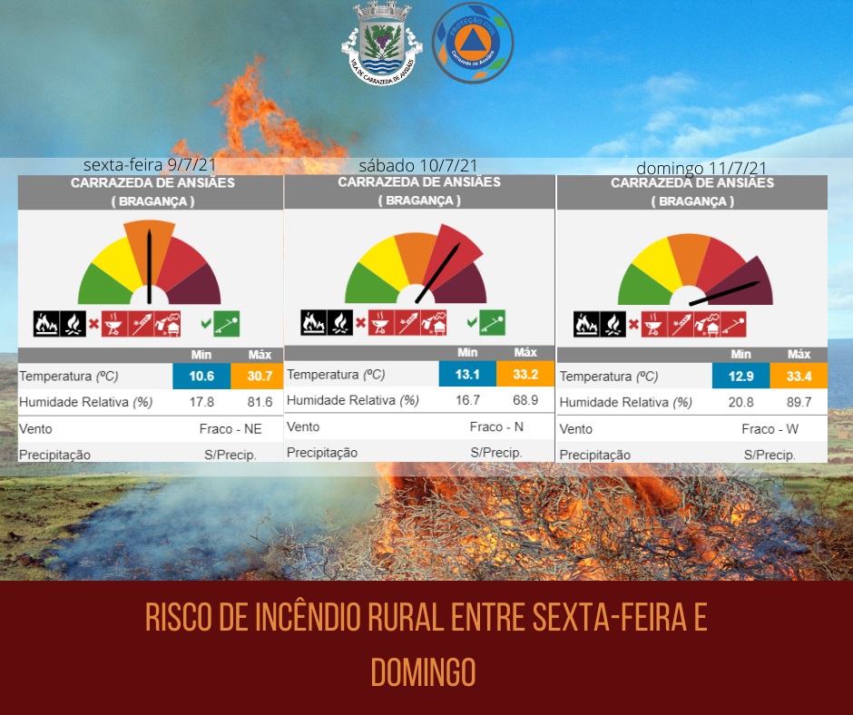 Face ao cenário meteorológico previsto para este fim de semana, de 9 a 11 de julho, com o aumento da temperatura máxima, o nosso concelho passa de Risco Elevado de incêndio, sexta-feira, para Risco Muito Elevado no sábado e Risco Máximo de Incêncio no domingo.