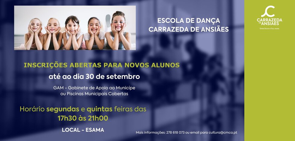 O Município de Carrazeda de Ansiães informa que estão abertas, até ao dia 30 de setembro, as inscrições para a Escola de Dança de Carrazeda de Ansiães.