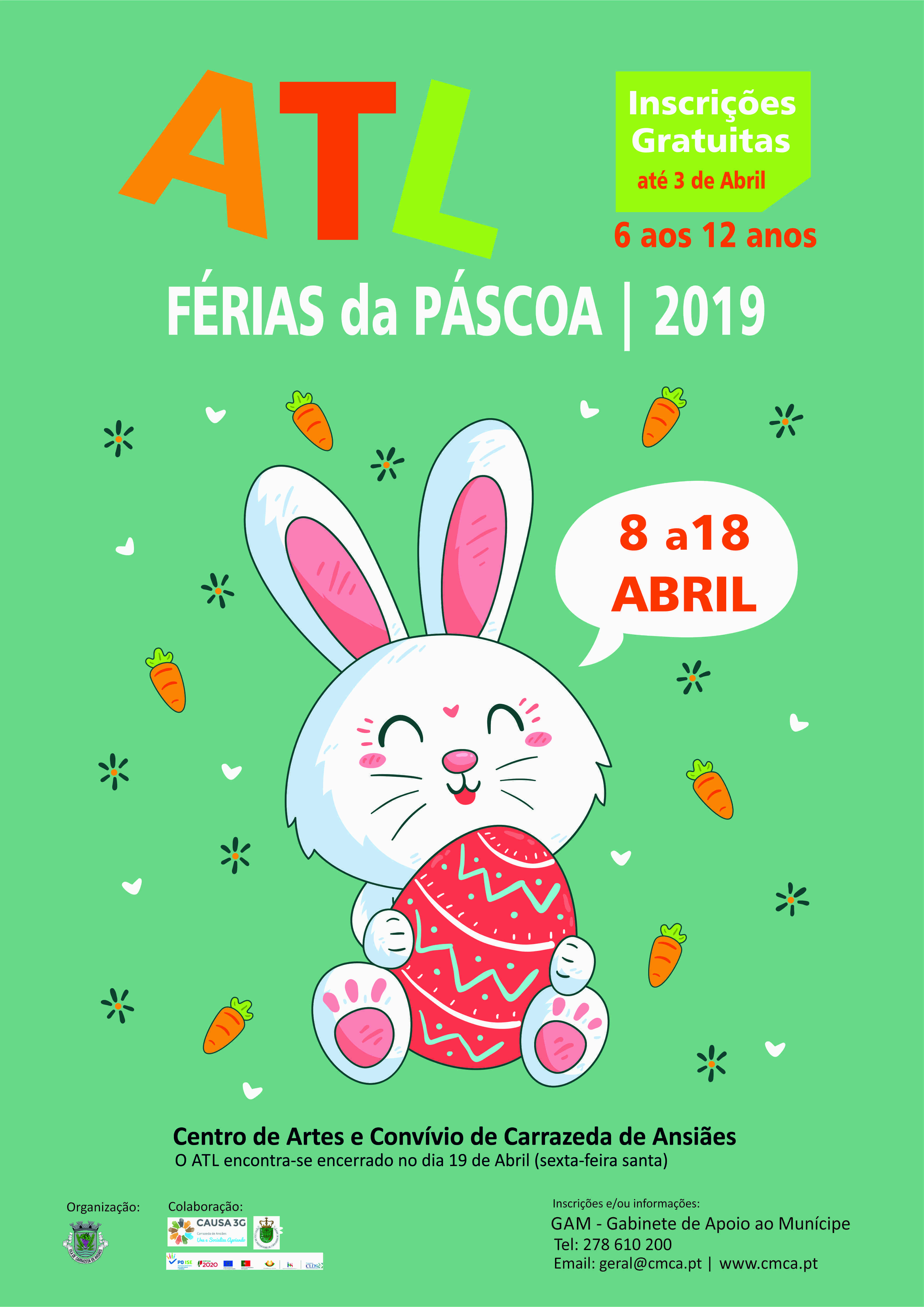O Município de Carrazeda de Ansiães informa que se encontram abertas, até ao dia 3 de Abril, as inscrições para o ATL Férias da Páscoa. As inscrições podem ser efectuadas no GAM, Gabinete de Apoio ao Municípe mediante o preenchimento da ficha de inscrição anexa.