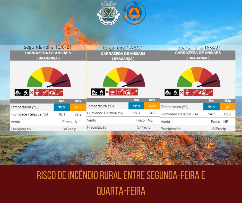 Face ao cenário meteorológico previsto para os próximos três dias, de hoje, 16 a 18 de agosto, as temperaturas elevadas e o tempo seco, põem Carrazeda de Ansiães na lista dos concelhos com risco máximo de incêndio segundo o Instituto Português do Mar e da Atmosfera (IPMA).